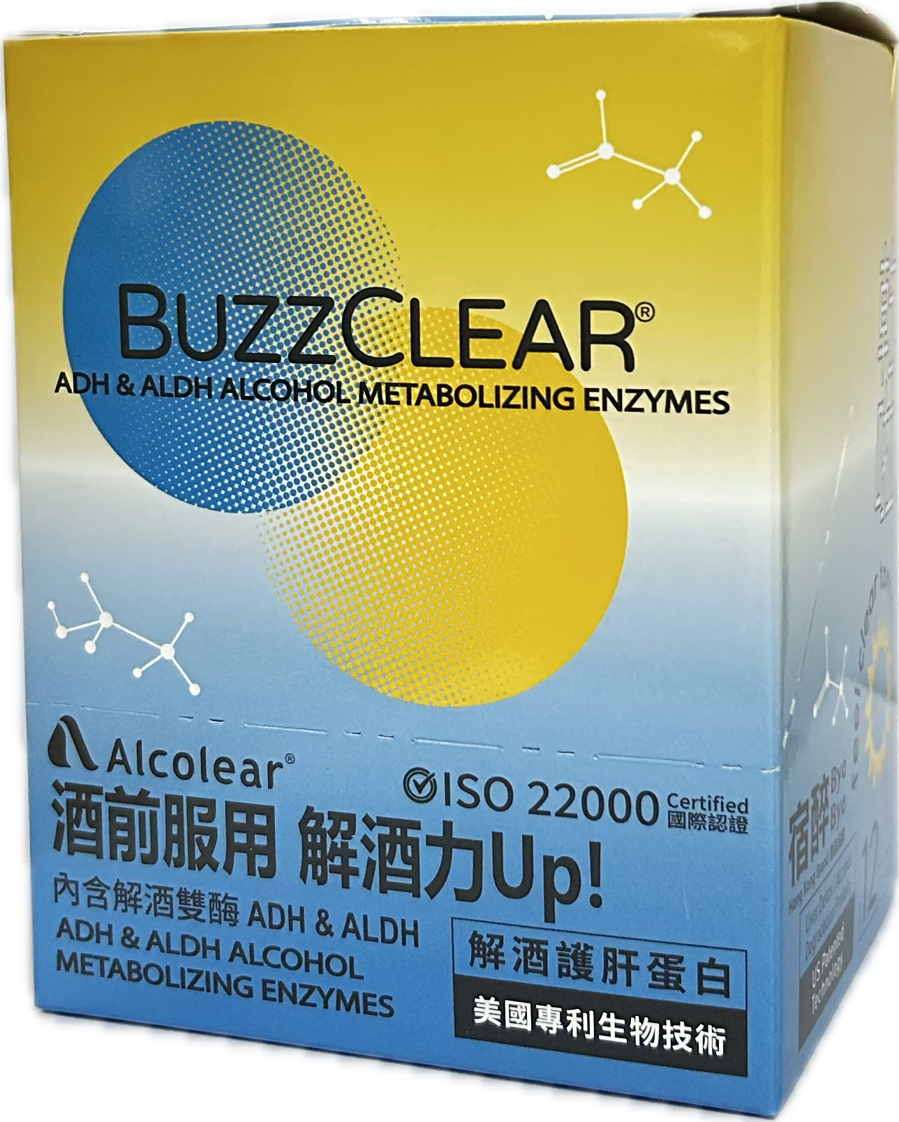 BUZZCLEAR® 是一種雙酶酒前酒精代謝劑,含有兩種對酒精代謝至關重要的天然雙酶。它可以直接消化酒精,讓您的肝臟不需要消化酒精,有助於減輕亞洲膚色的症狀,改善酒後睡眠,保護肝臟,並有助於防止過早老化。